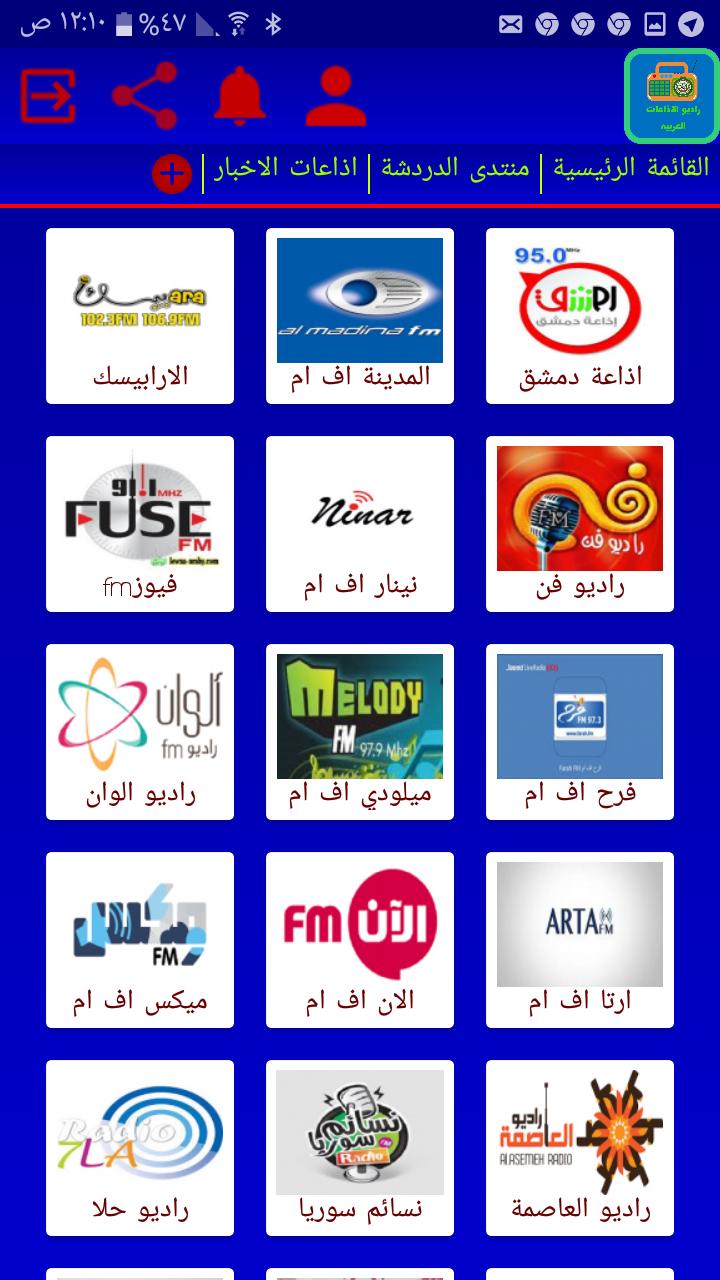 تطبيق اذاعات ومحطات الراديو العربية يحتوي على مجموعة كبيرة من الاذاعات العربية اللتي تبث من جميع انحاء العالم العربي والاذاعات العربية في كندا والاذاعات العربية في فرنسا ولندن والولايات النتحدة اليكم نبذة عن الاذاعات الموجودة في تطبيقنا ونبدا ب راديو الاذاعات السورية اذاعة دمشق المدينة اف ام الارابيسك راديو فن نينار اف ام فيوز اف ام فرح ميلودي سوريا راديو الوان ارتا الان ميكس العاصمة نسائم سوريا راديو حلا امواج الكرمة ناو الكل عين الجمهورية صدى اف ام راديو ديرتنا وننتقل الان الى راديو الاذاعات الفلسطينية حريةان راديو الموسيقى سراج اف ام وايضا يو جد الاذاعات المصرية تسعينات اف ام راديو مصر ويحتوي ايضا على مجموعة كبيرة من الاذاعات الاسلامية ومحطات راديو واذاعة تونس ومحطات راديو اذاعات الجزائر ومحطات راديو اذاعات المغرب ومحطات راديو الاردن ومحطات راديو العراق ومحطات راديو الخليج كما يحتوي تطبيقنا على منتدى وشات للدردشة والتعارف بين اعضاء التطبيق Arabic radio stations